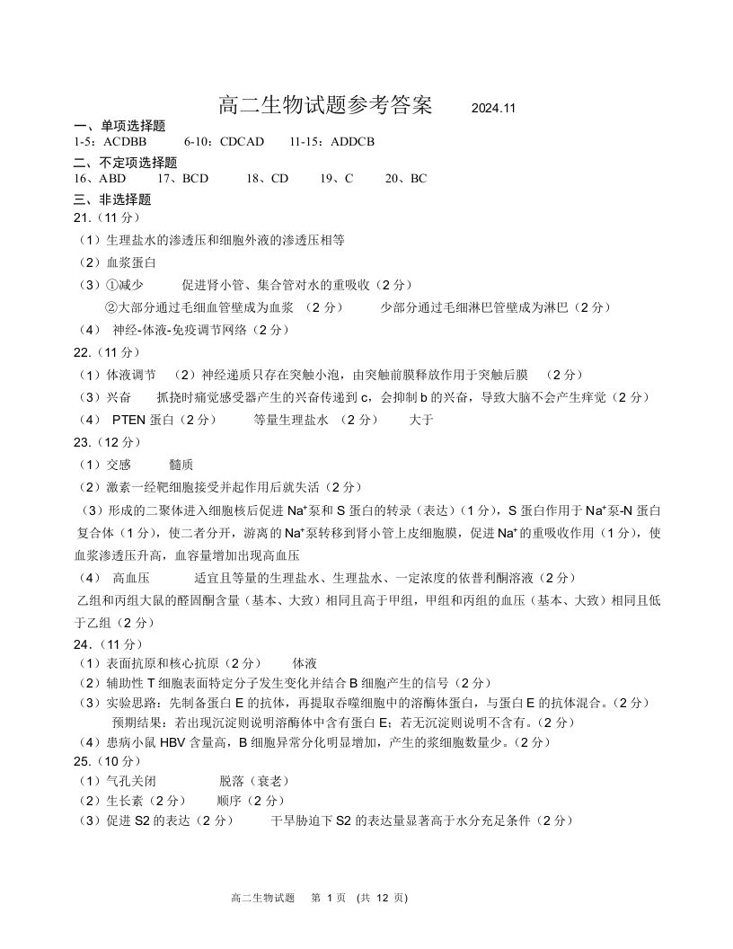 山东省青岛市区域2024.11高二年级期中检测试题生物答案