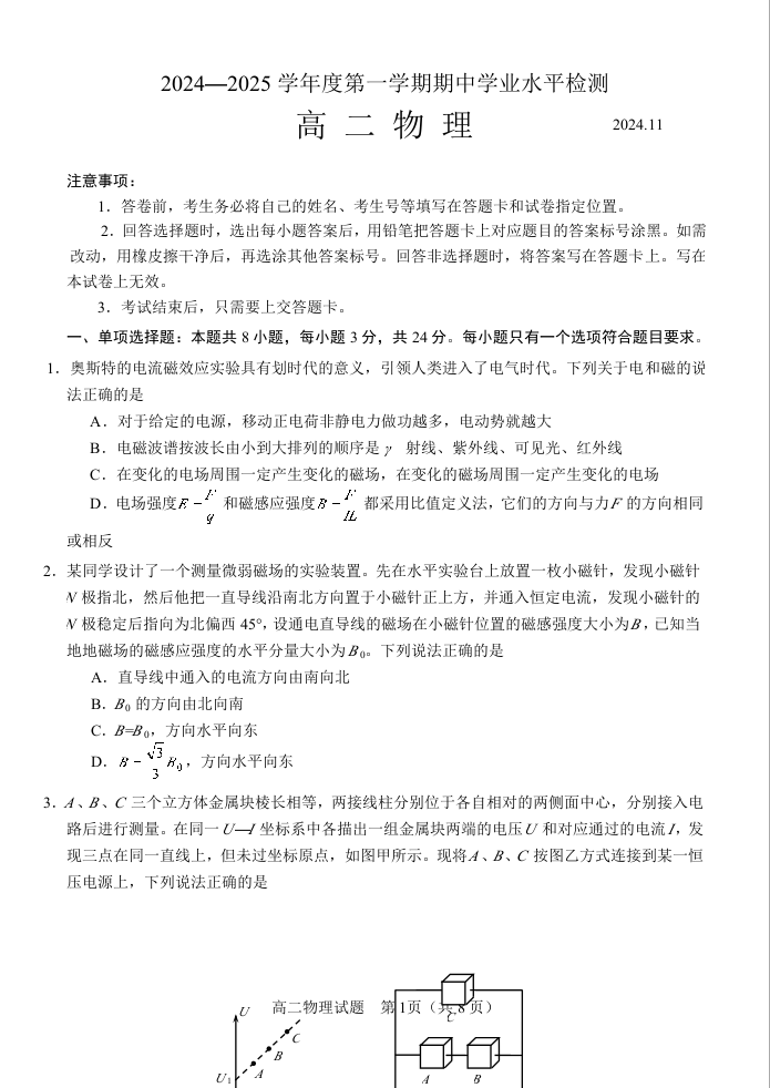 山东省青岛市区域2024.11高二年级期中检测试题物理