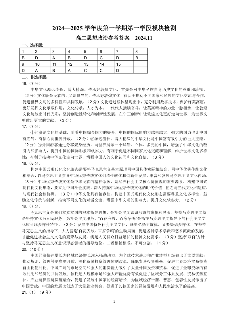 山东省青岛市区域2024.11高二年级期中检测试题政治答案