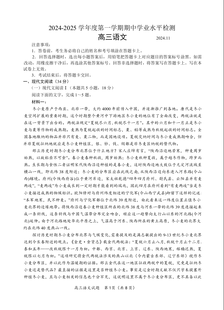 山东省青岛市区域2024.11高三年级期中检测试题语文
