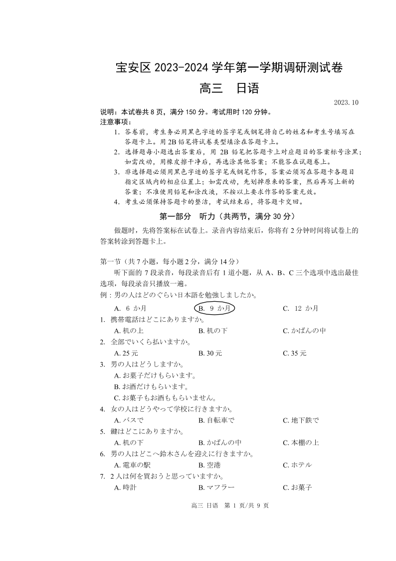 【试卷】深圳市宝安区2023~2024学年第一学期调研测试卷高三日语