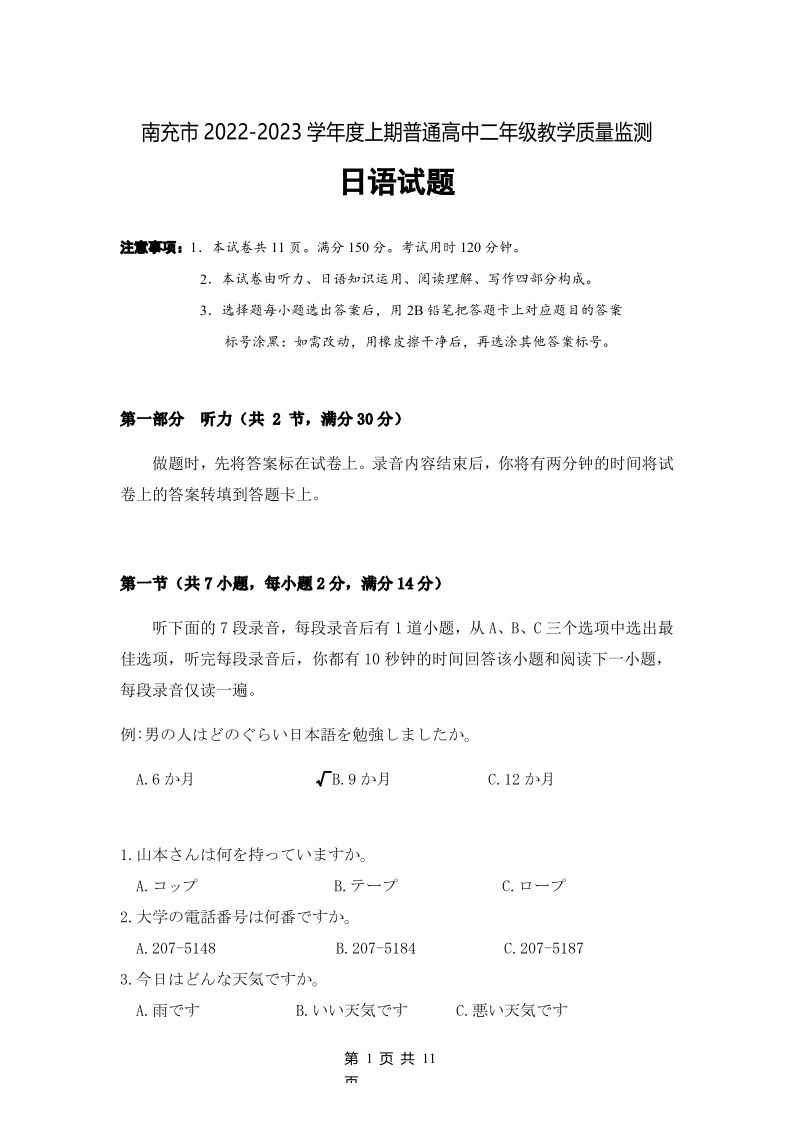 南充市2022-2023学年(上)高二日语教学质量监测考试【试卷】