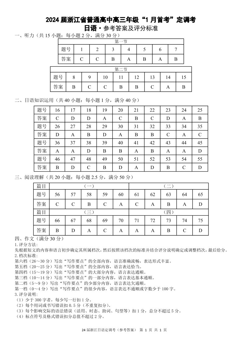 【答案】2024届浙江省普通高中高三年级“1月首考”定调考(日语)