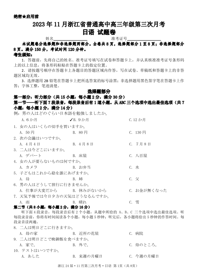 【试题】2023年11月浙江省普通高中高三年级第三次月考日语