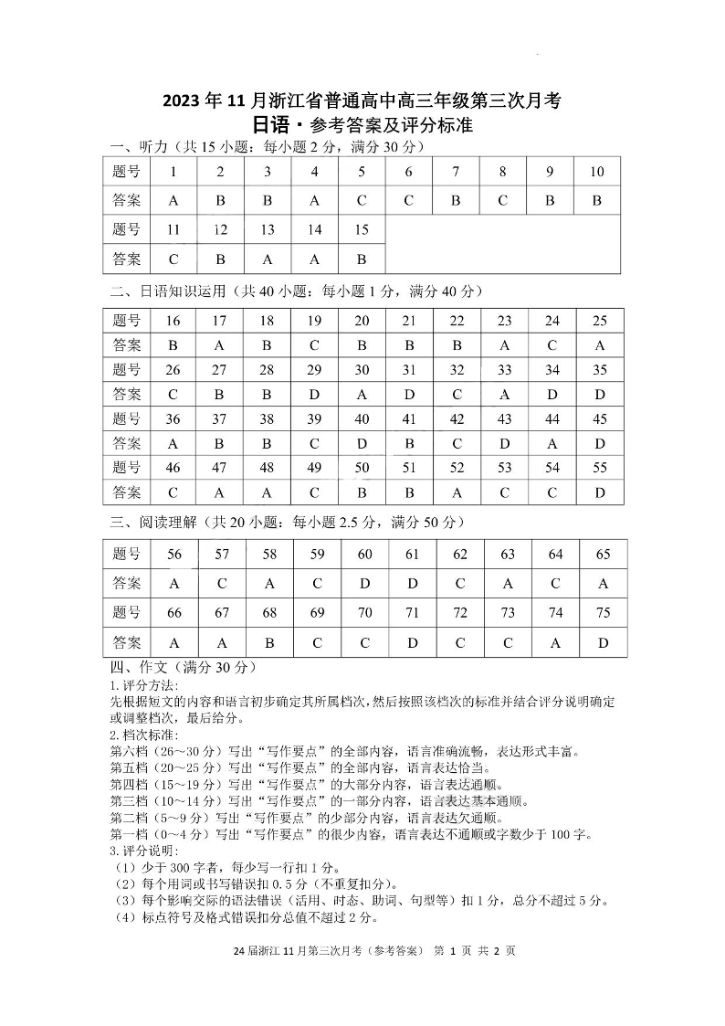 【答案+听力原文】2023年11月浙江省普通高中高三年级第三次月考日语