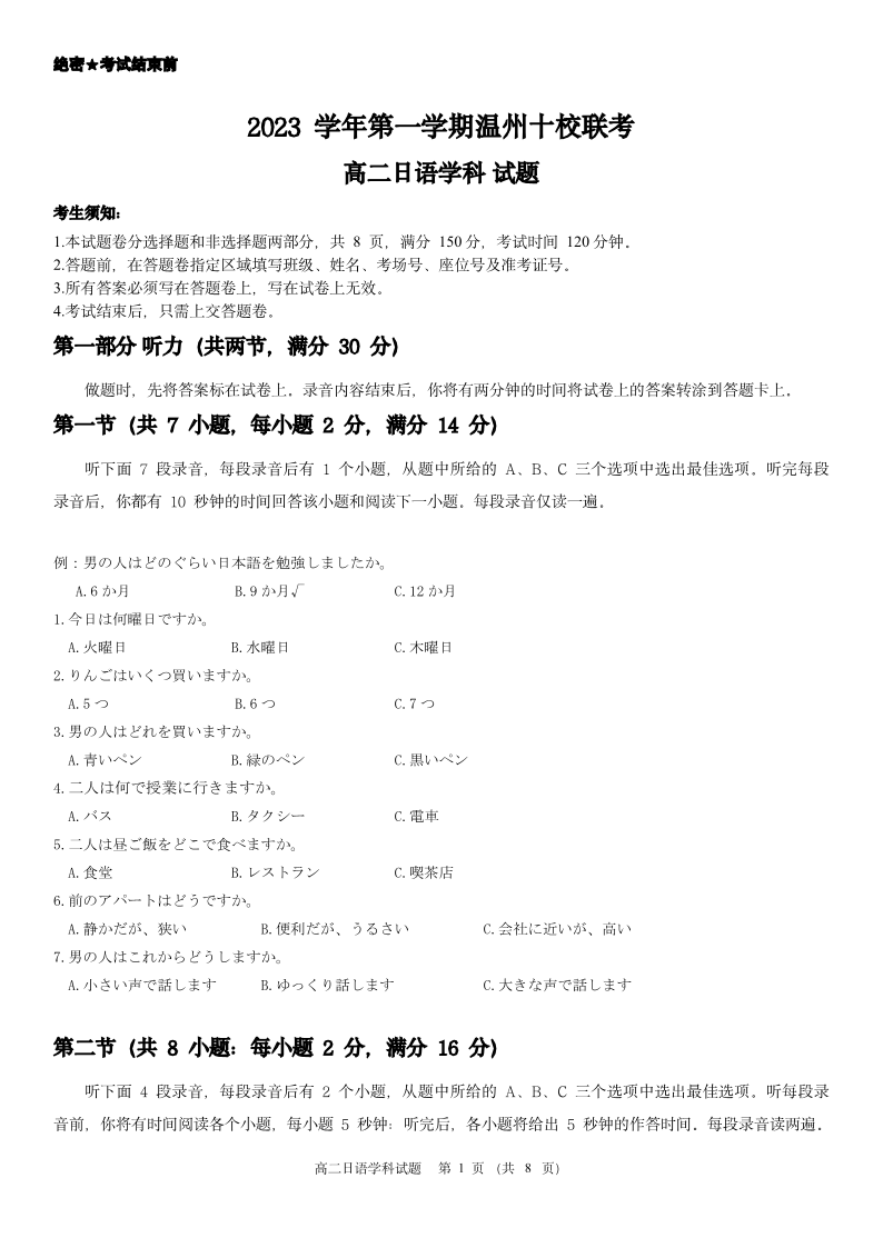 【试题】2023学年第一学期温州十校联考高二日语学科(试题)