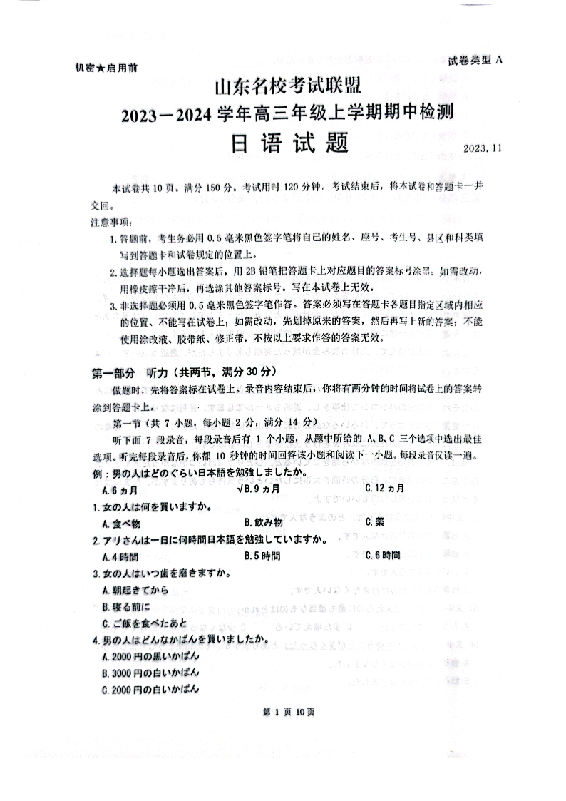 山东省山东名校考试联盟2023-2024学年高三上学期11月期中日语试题