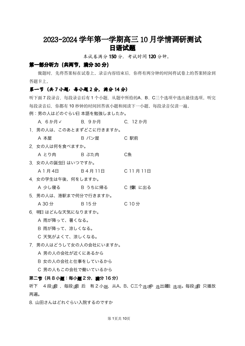 【试题】江苏省高邮市2024届10月学情调研测试日语