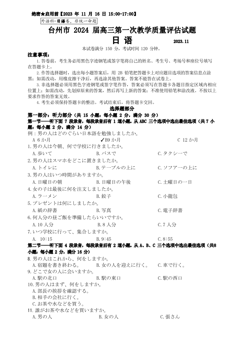 【试卷】台州市2024届高三第一次教学质量评估试题-日语