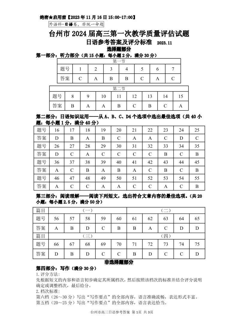 【答案】台州市2024届高三第一次教学质量评估试题