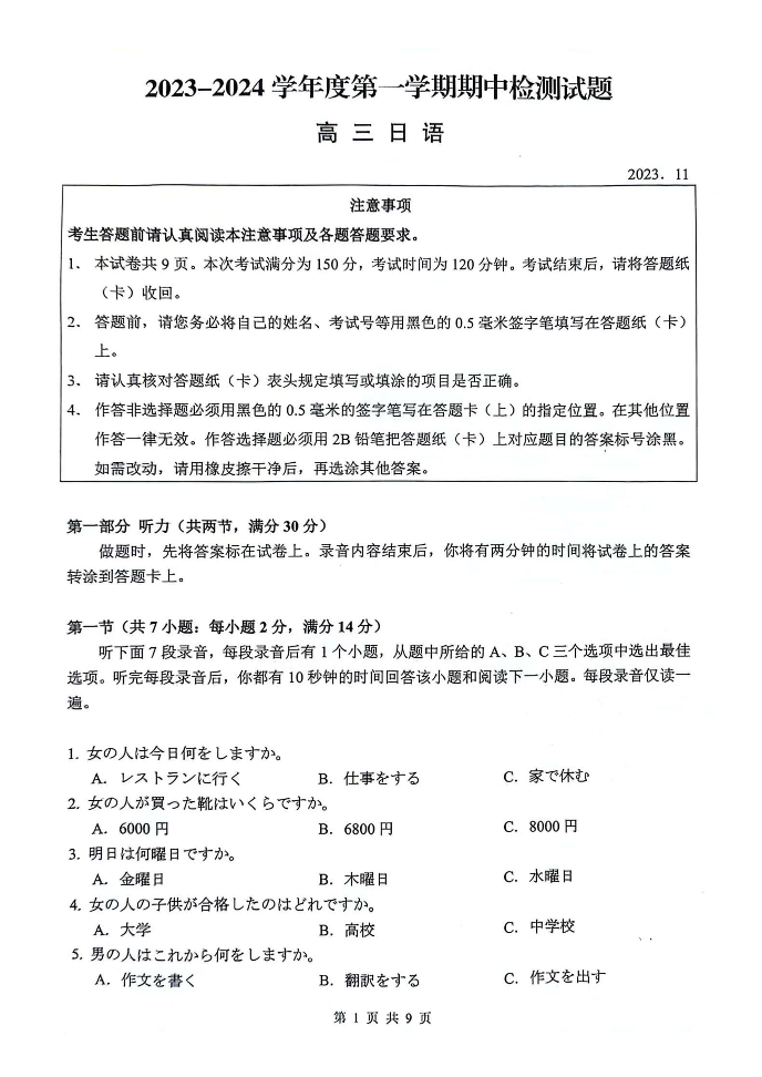 【试题】江苏省扬州市2023-2024学年高三上学期11月期中日语