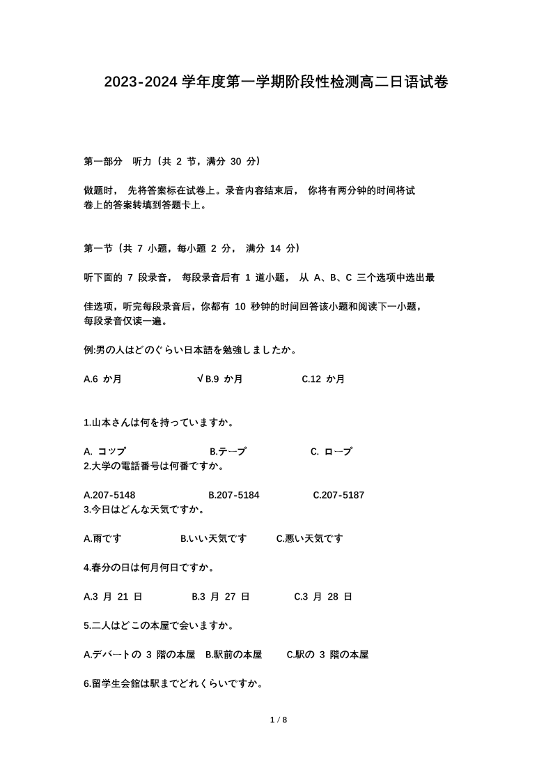 2023-2024学年度第一学期阶段性检测高二日语试卷
