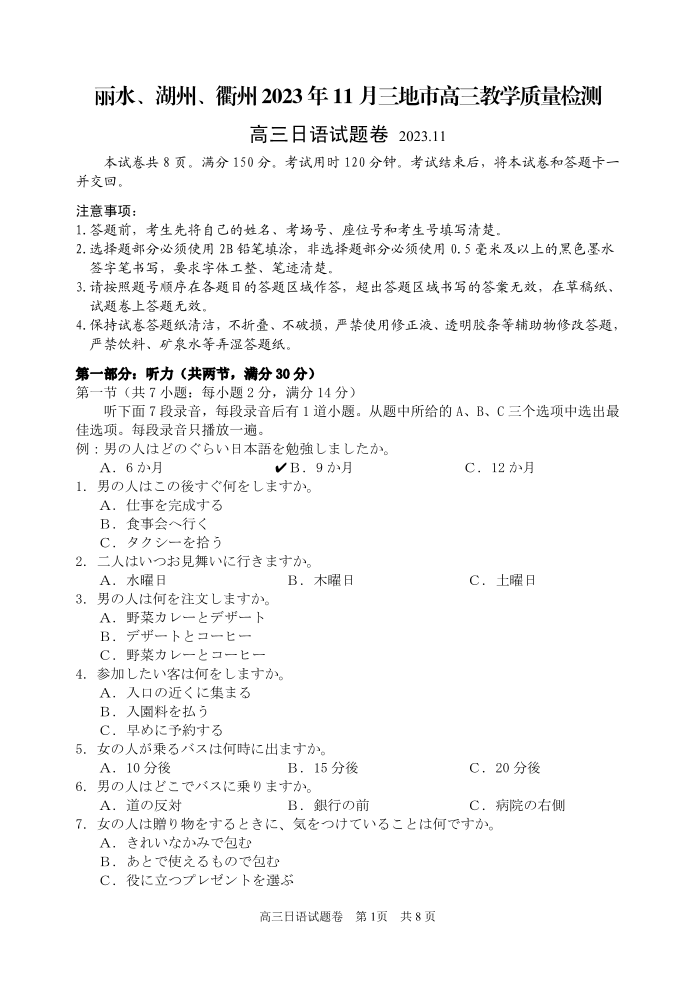 丽水、湖州、衢州2023年11月高三日语一模(试题卷)