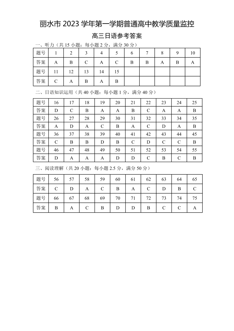 丽水、湖州、衢州2023年11月高三日语一模(答案)