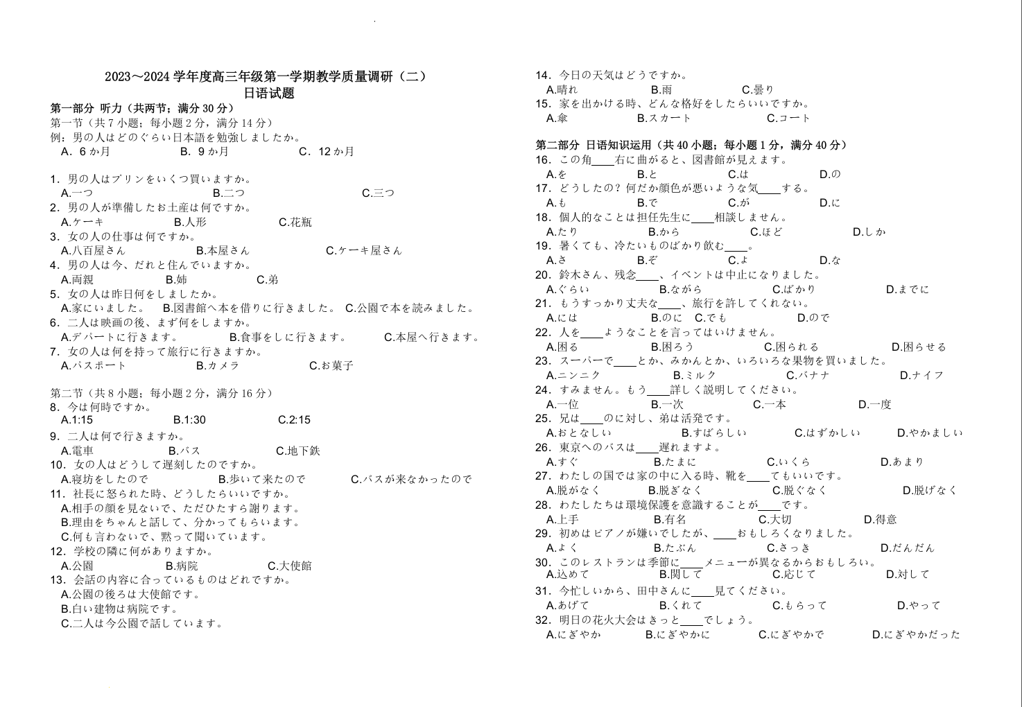 【试题】江苏省如皋市2023~2024学年高三上教学质量调研(二)+(期中)