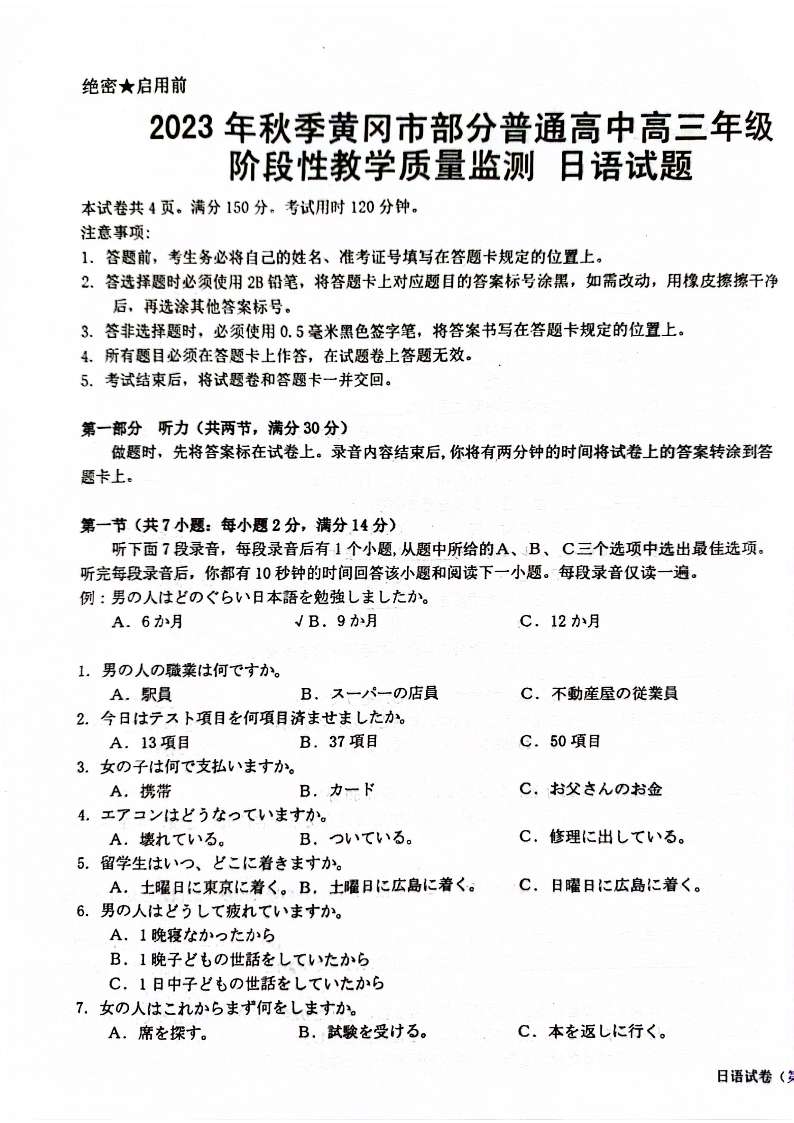 (日语试题)2023年秋季黄冈市部分普通高中高三年级阶段性教学质量检测