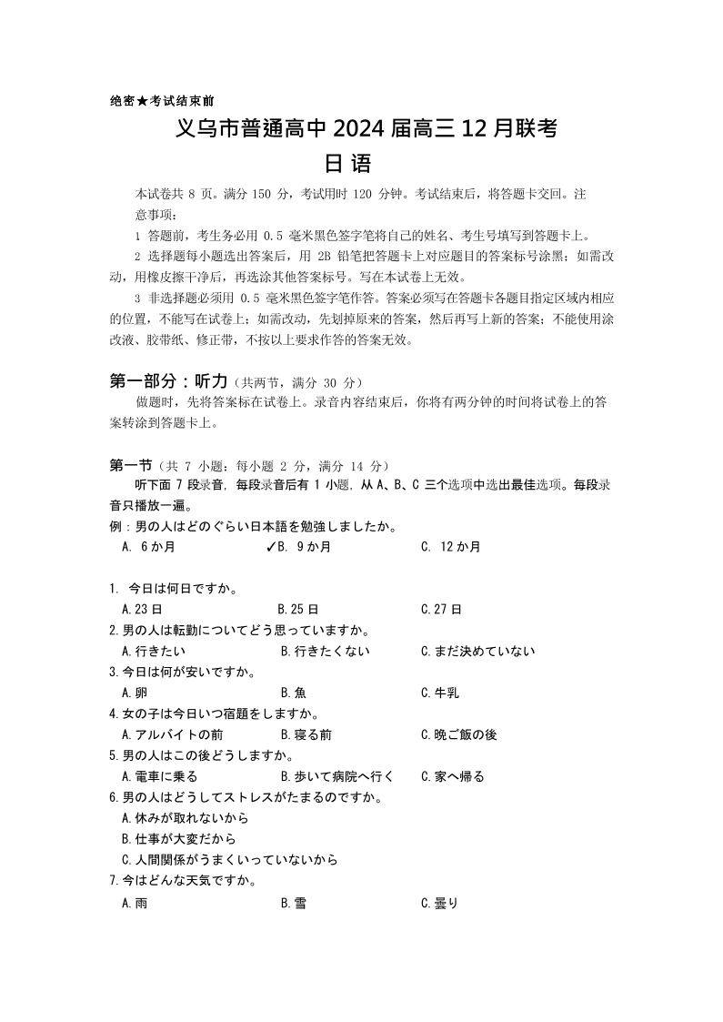 义乌市普通高中2024届高三上学期12月联考日语【试题】