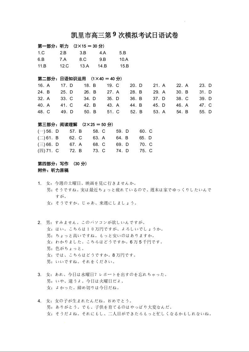 凯里市高三第九次模拟考试日语答案
