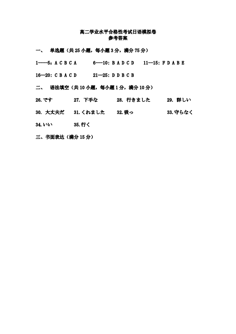 参考答案---高二学业水平合格性考试日语模拟卷