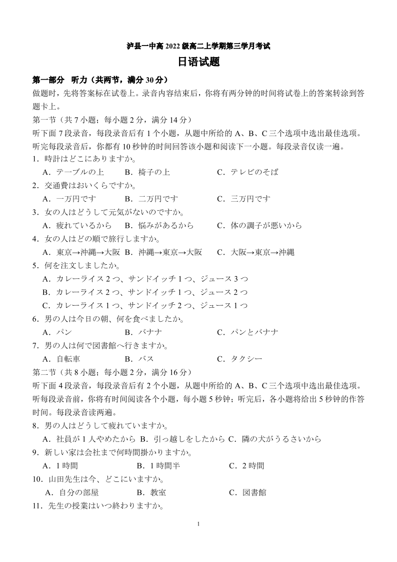 泸县一中2022级高二上学期第三学月考试日语【试题】