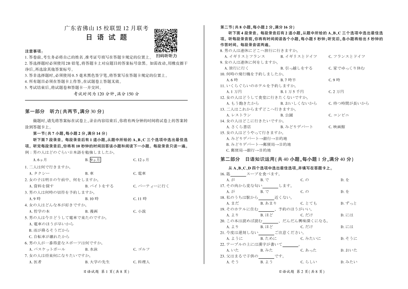 日语广东省佛山15校联盟12月联考