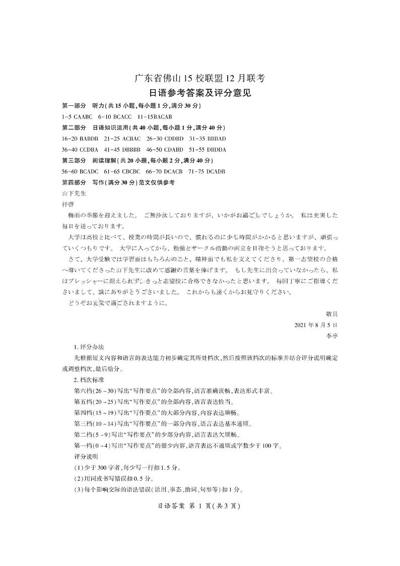 答案广东省佛山15校联盟12月联考