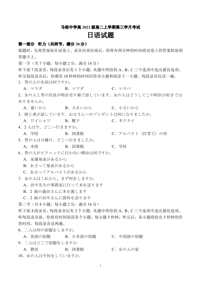 马街中学高2022级高二上学期第三学月考试日语【试题】