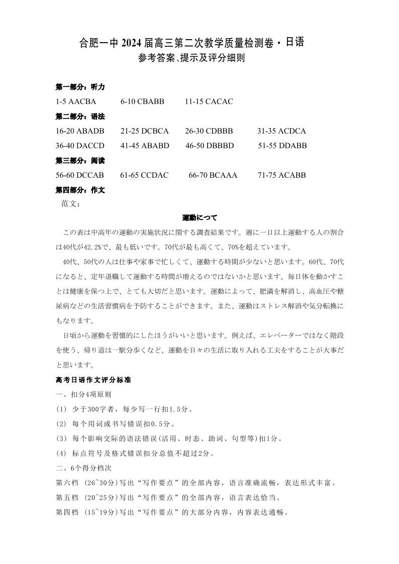 合肥一中2024届高三第二次教学质量检测卷日语【答案】