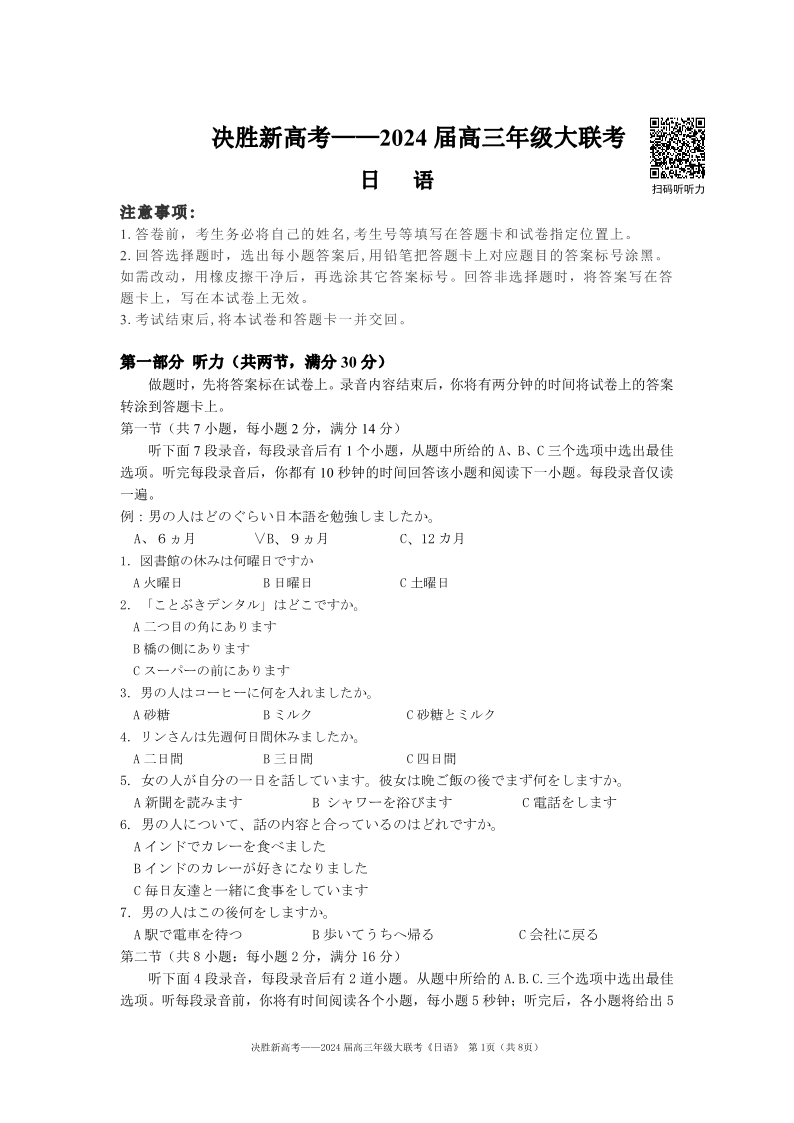 决胜新高考2023-2024学年高三上学期12月大联考日语试题