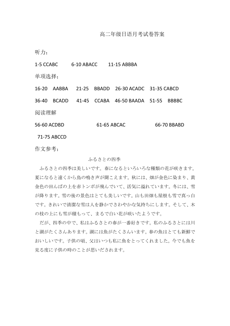 皖北协作区11月份高二年级日语质量检测答案