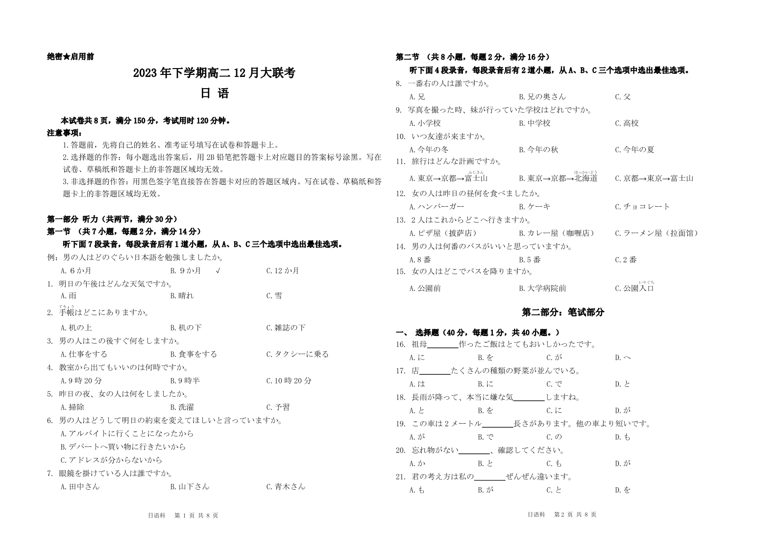 湖南省多校联考2023-2024学年高二上学期12月月考日语【试题】