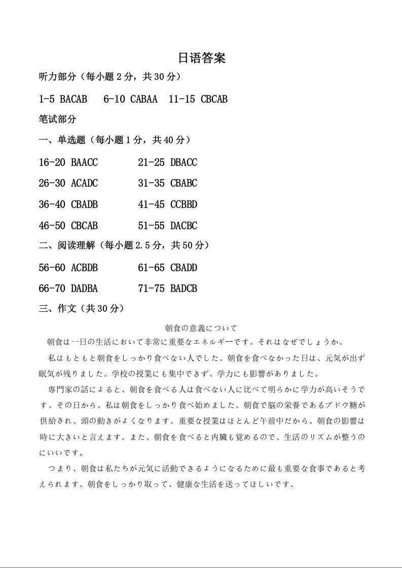 湖南省2023-2024学年高三上学期12月联考日语试题答案