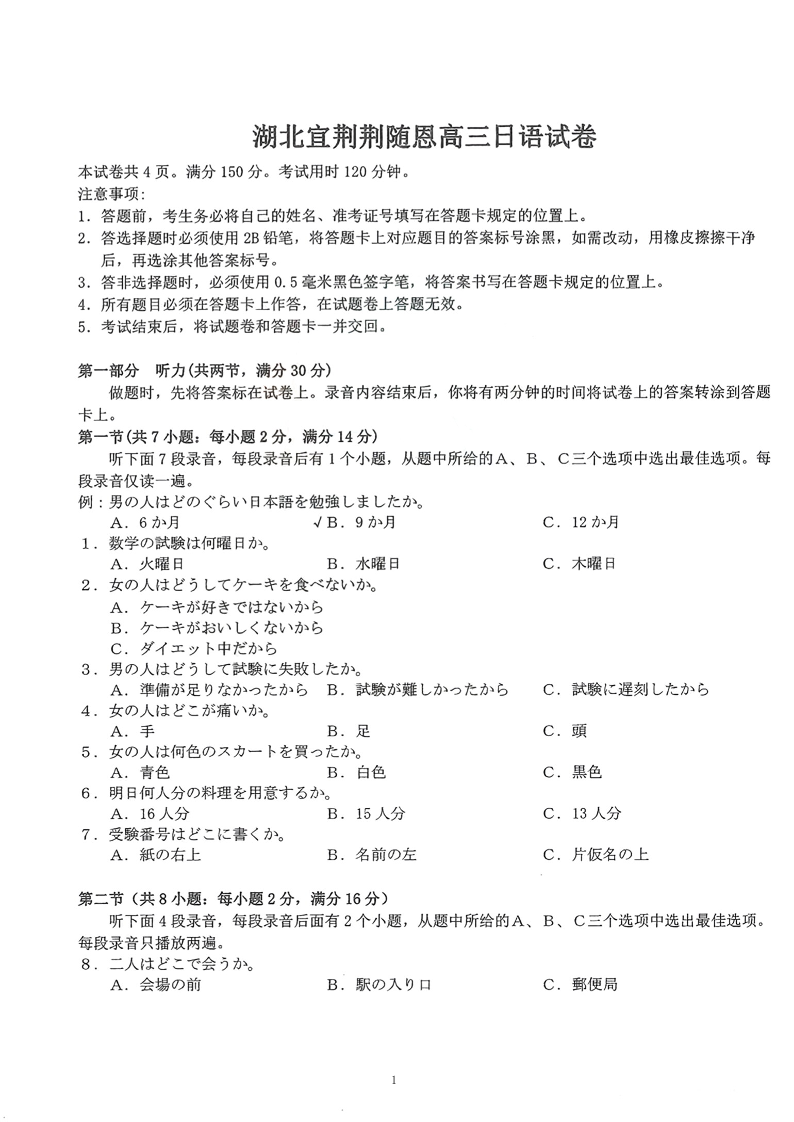 湖北省宜荆荆随2023-2024学年高三上学期12月联考日语试题