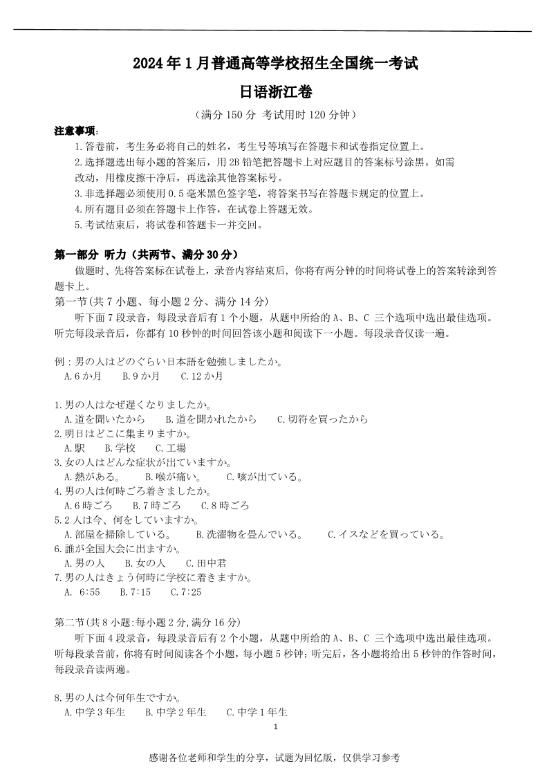 【试题+答案】2024年1月浙江首考日语