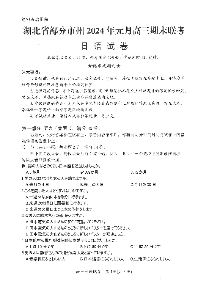 湖北省部分市州2024年元月高三期末联考·日语试卷