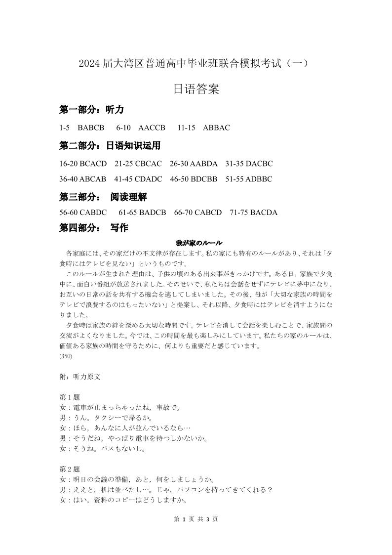2024届广东省大湾区普通高中高三上学期联合模拟考试(一)日语答案