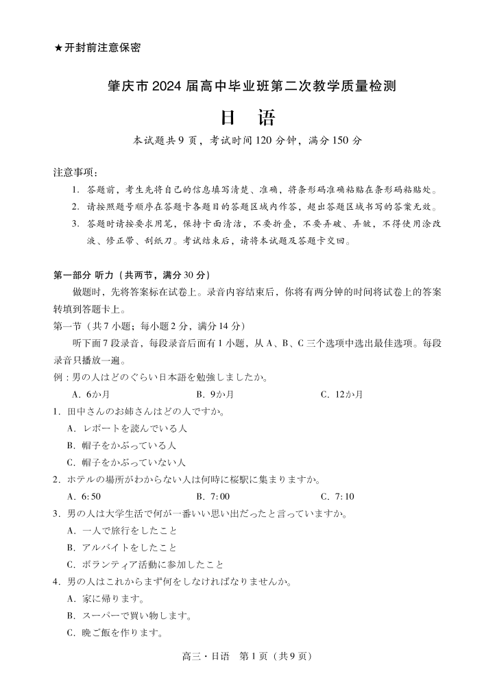 肇庆市2024届高三第二次教学质量检测日语【试题】