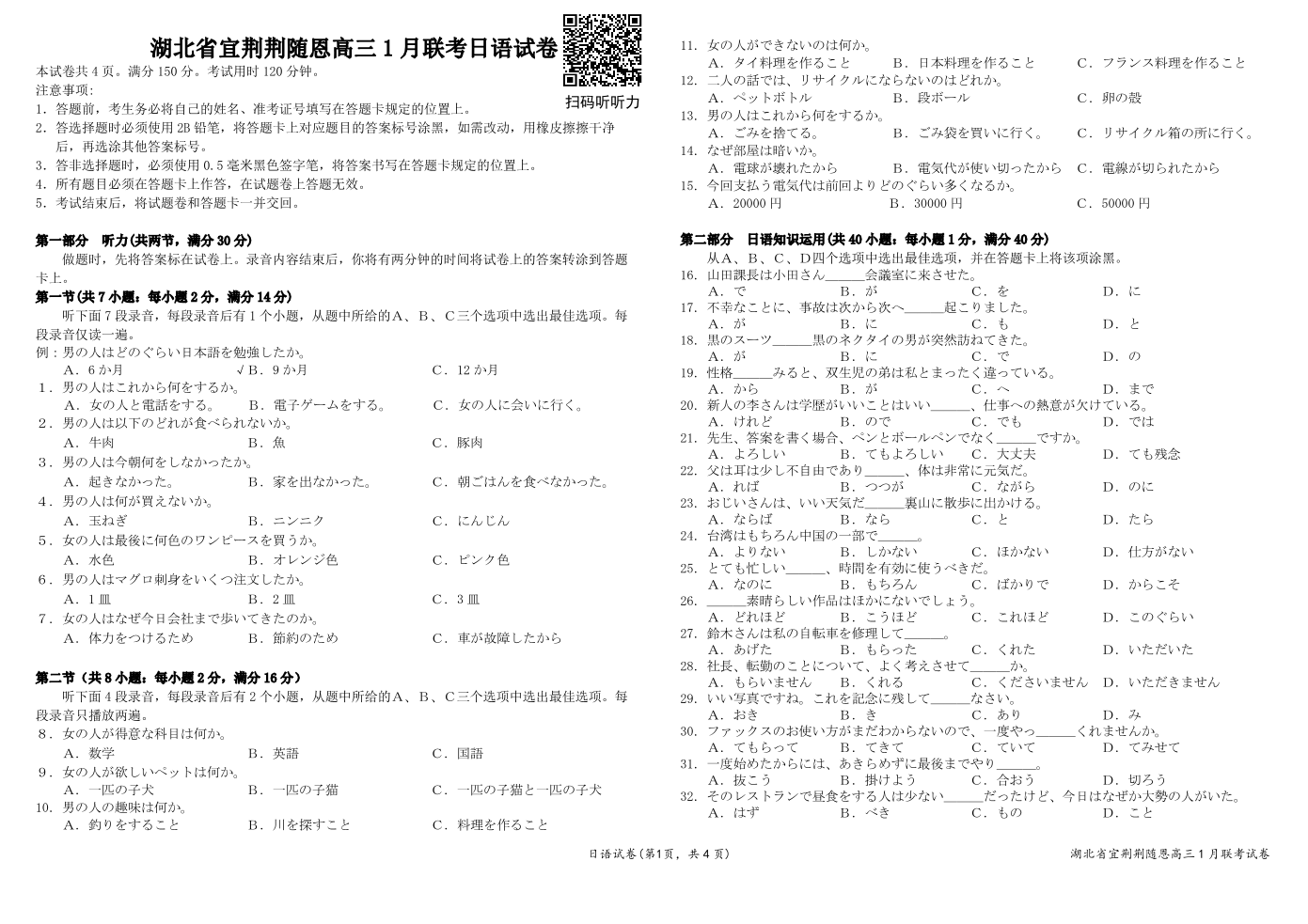 湖北省宜荆荆随恩2023-2024学年高三上学期1月期末联考日语试题