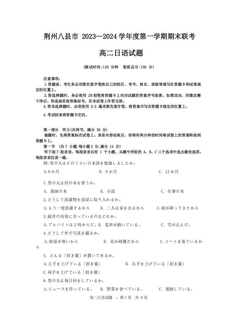 荆州八县市+2023—2024学年度第一学期期末联考高二日语试题