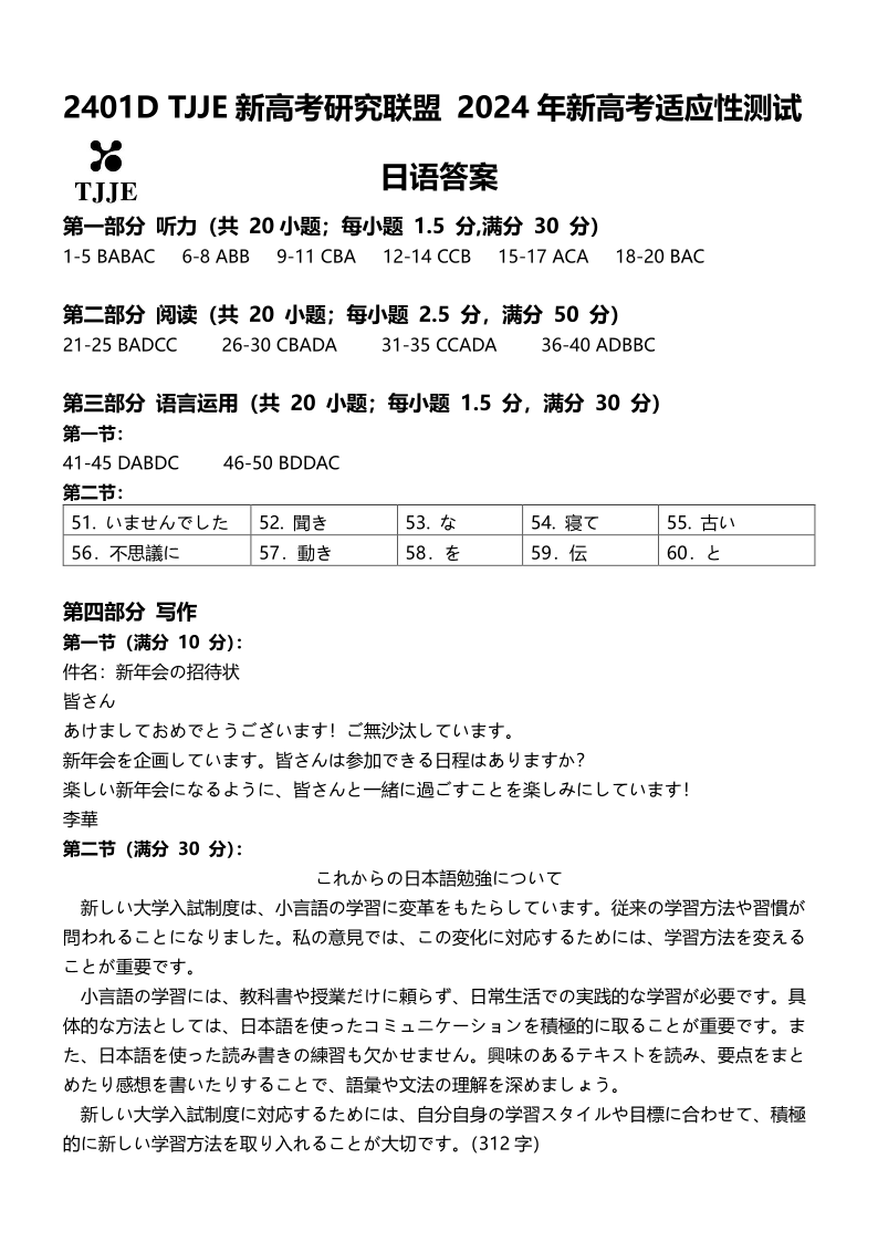 答案++2024届山西省TJJE新高考研究联盟高三上学期1月新高考适应性考试日语