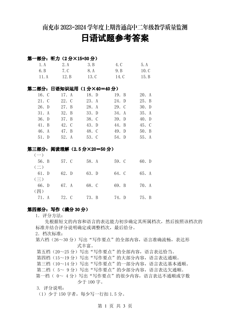 南充市2023-2024学年(上)高二日语教学质量监测考试参考答案及听力原文