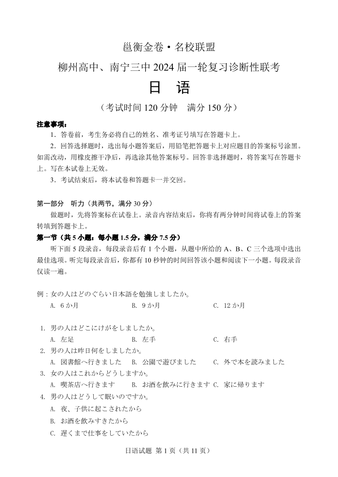 邕衡金卷·名校联盟++柳州高中、南宁三中2024届诊断性联考日语试题