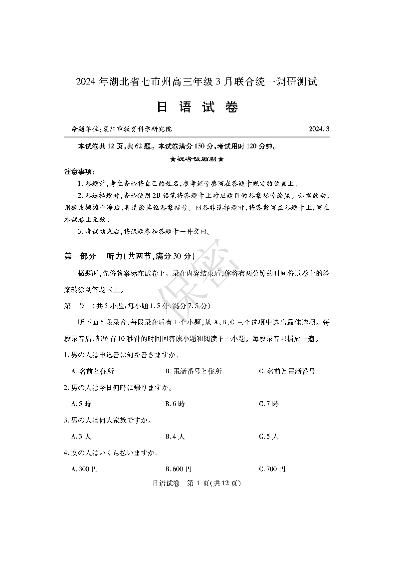 湖北省七市州2024届高三下学期3月联合统一调研测试+日语
