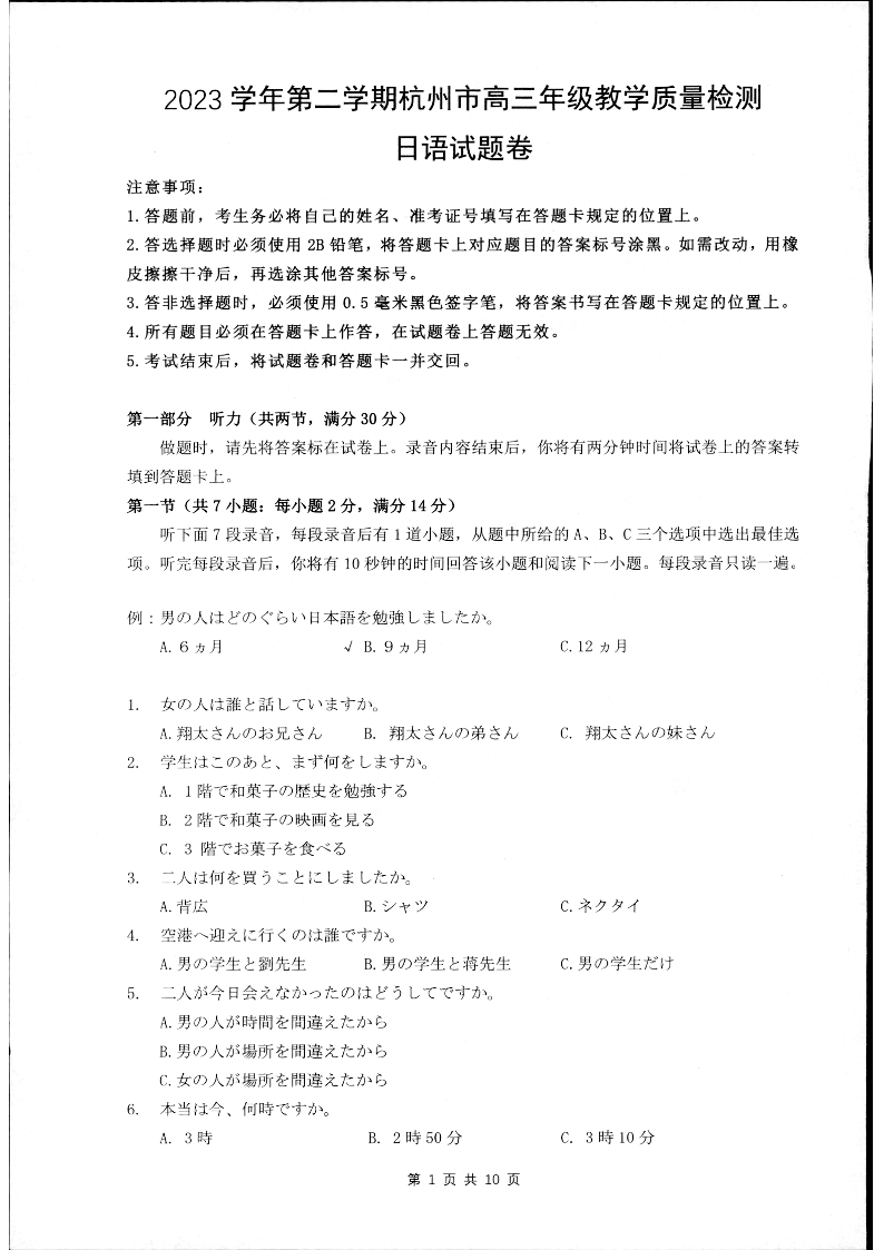 2024届浙江省杭州市杭州市高三下学期二模日语试题