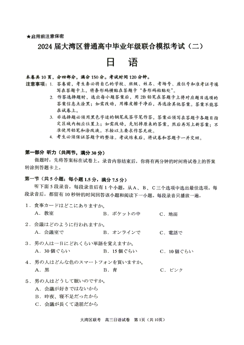 2024届大湾区普通高中毕业年级联合模拟考试(二)日语