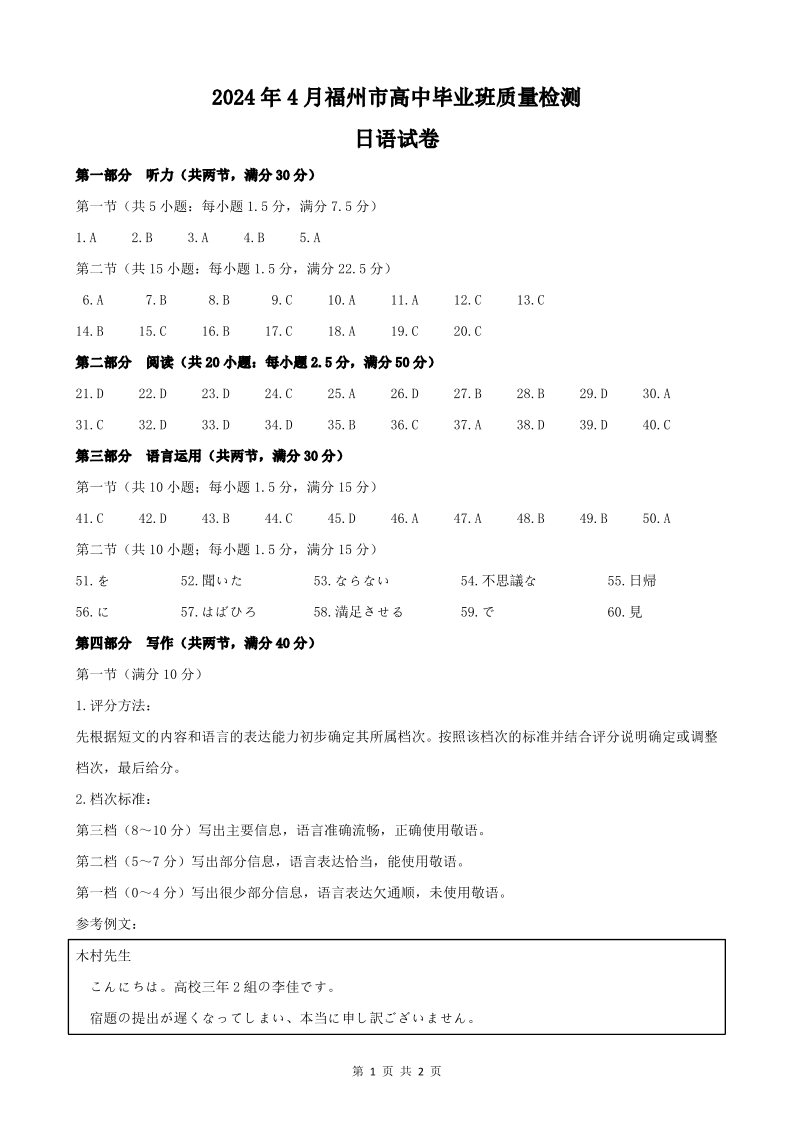 【参考答案】2024届福州市高三4月质量检测日语