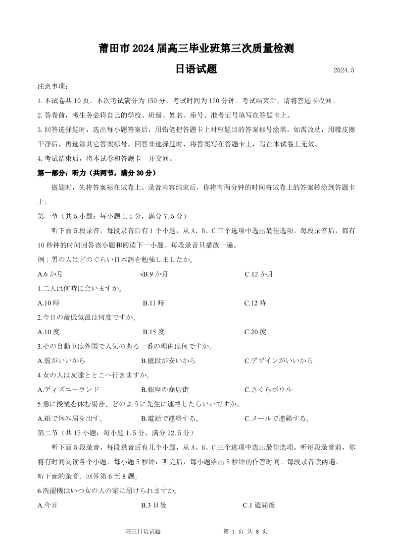 福建省莆田市2024届高三第三次教学质量检测日语试题(新题型)