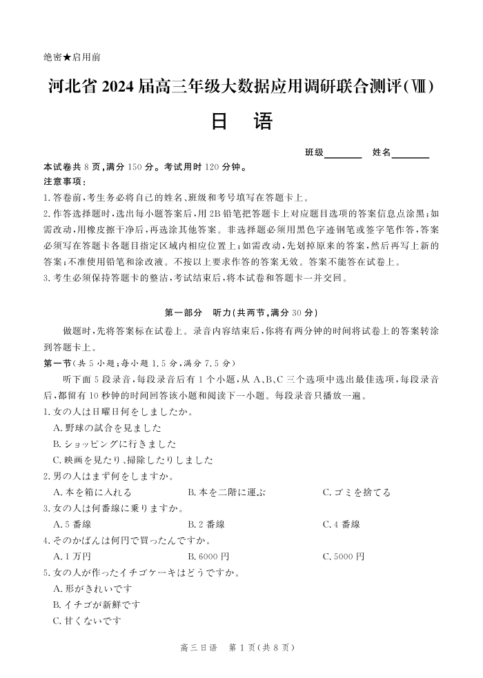 河北省2024届高三年级下学期大数据应用调研联合测评(Ⅷ)日语