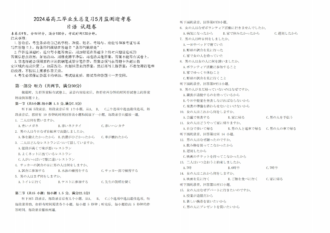 高三日语试题卷(印刷版)