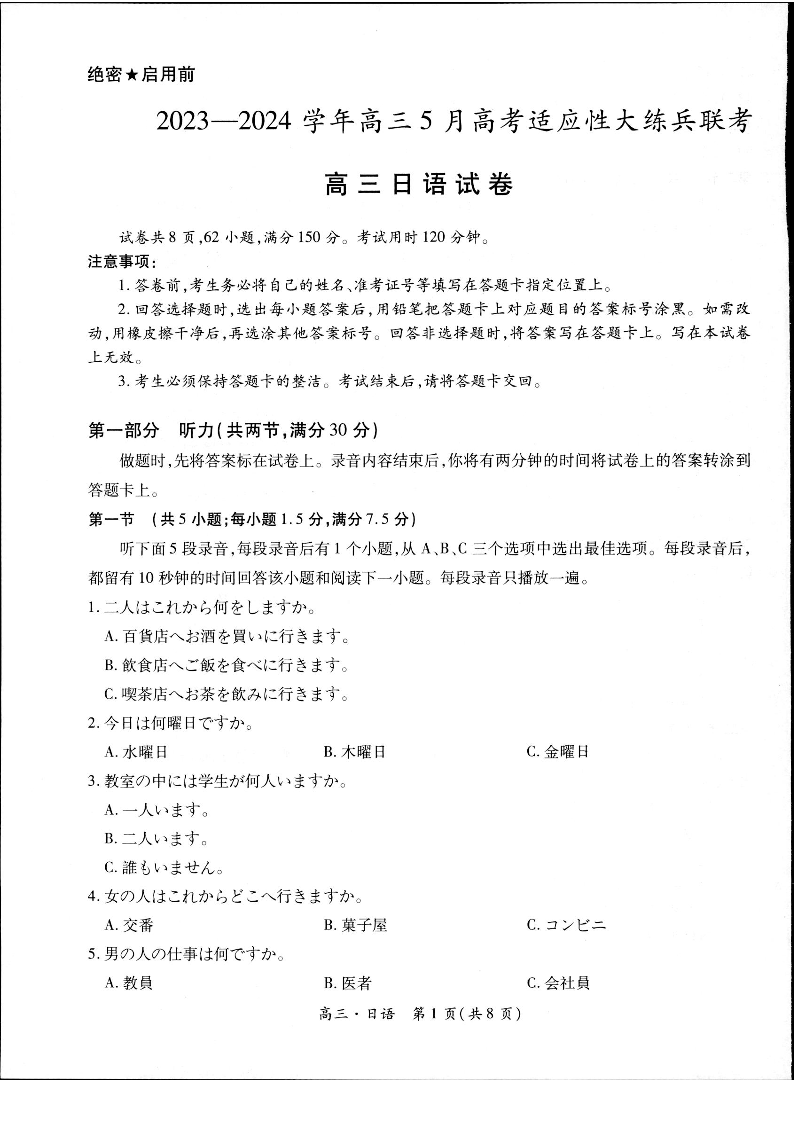 日语试卷-2024届江西省上进联考高考第二次适应性考试